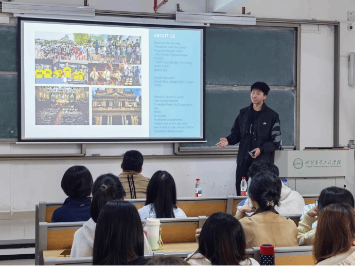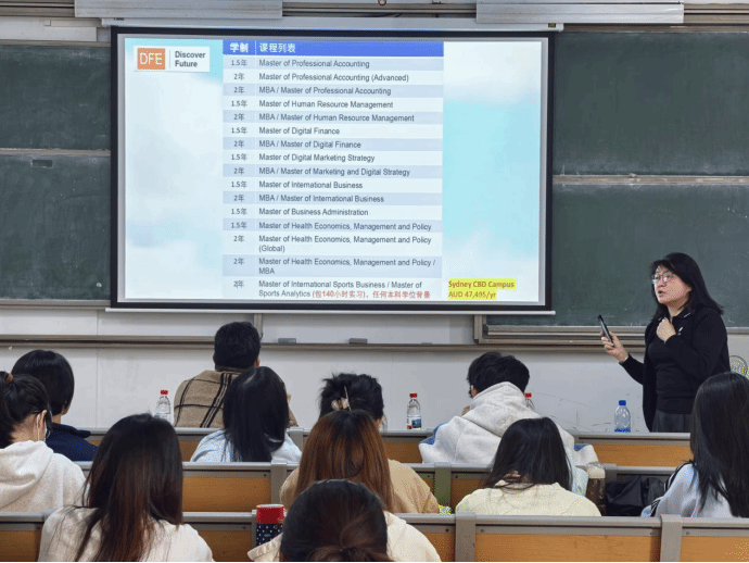 宣讲会开始,对外交流合作部副部长赖菊热情致辞,对澳洲纽卡斯尔大学国际合作项目官方代表蒋伟教授的到来表示诚挚欢迎。随后,蒋伟教授结合自身在澳洲的生活和教学经历,用生动的语言介绍了澳洲高等教育的特色、专业课程设置、课堂教学模式等,并重点解读了“3+1+X”硕士项目、“短期研学”等适合不同学生群体的项目。最后的互动环节中,蒋伟教授邀请学员Eric作为“海外生活体验官”,以同龄人的视角分享求学经历,拉近了与在场学生的距离,更让国际教育的图景变得可触可感。