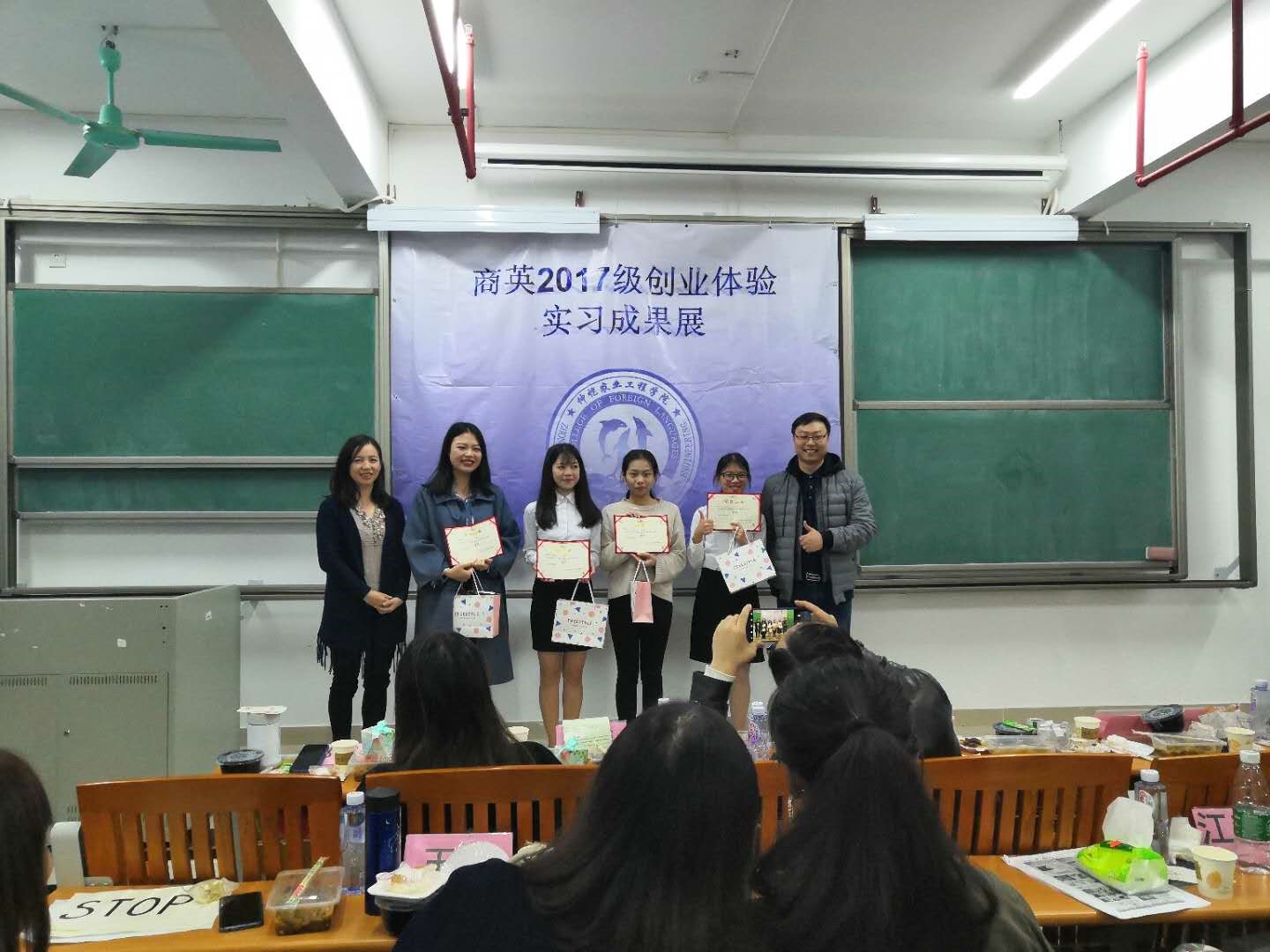 最后,老师与参赛队伍及全体工作人员上台合影留念。至此,2017级商务英语专业创业项目活动成果展圆满结束。