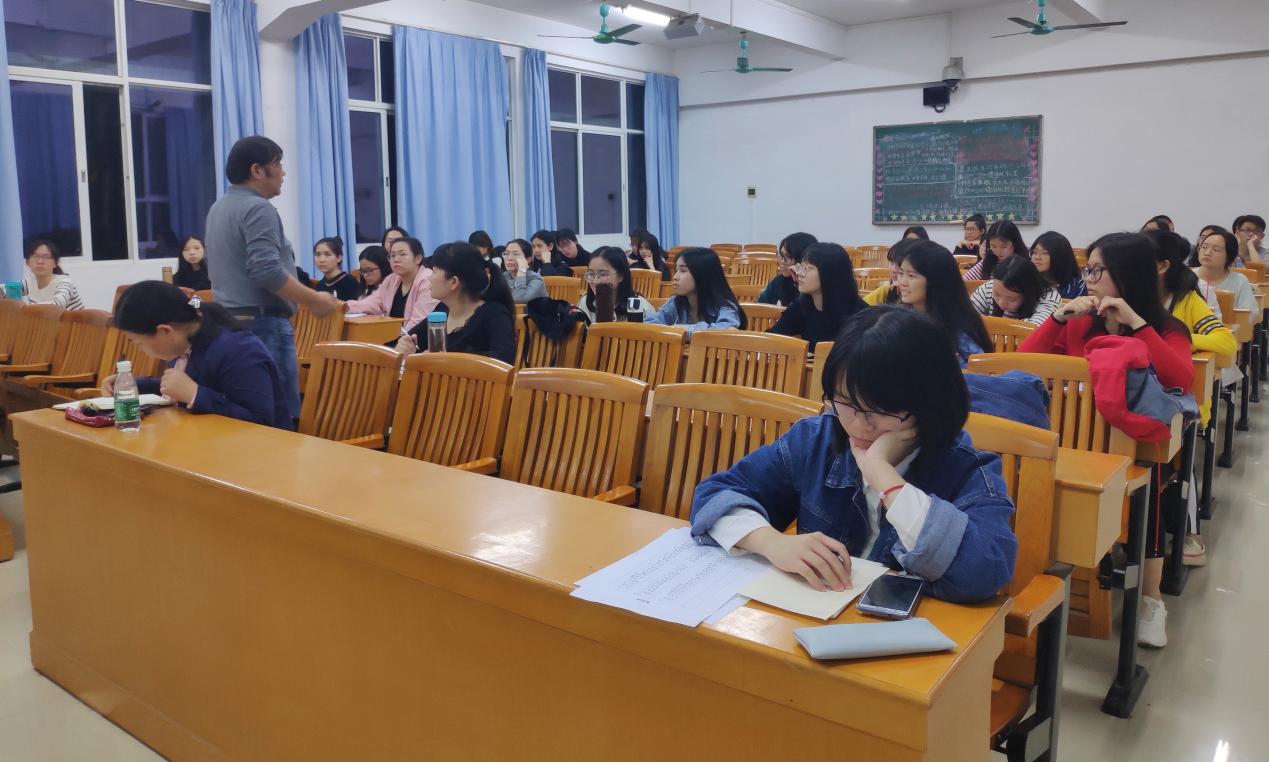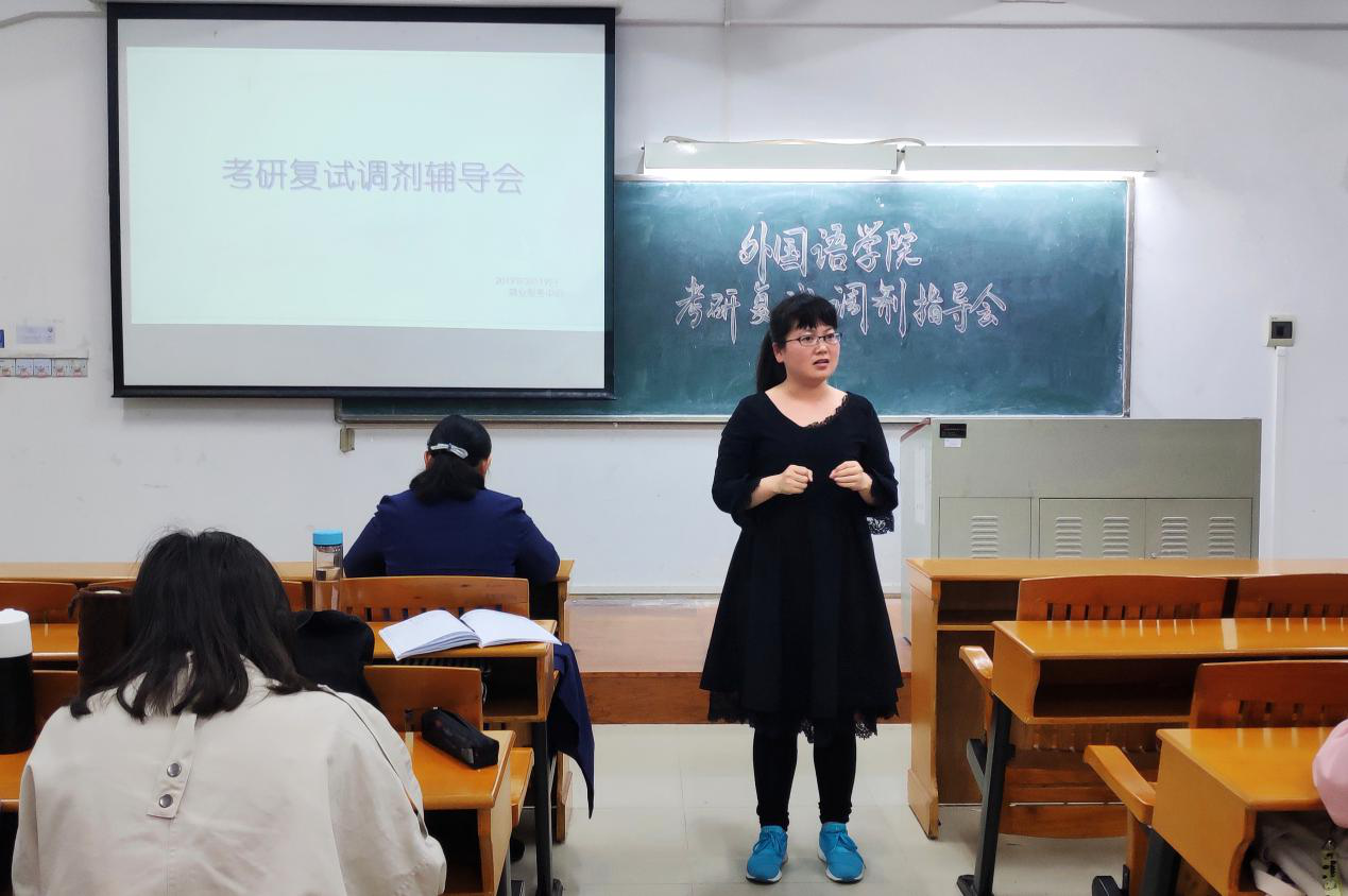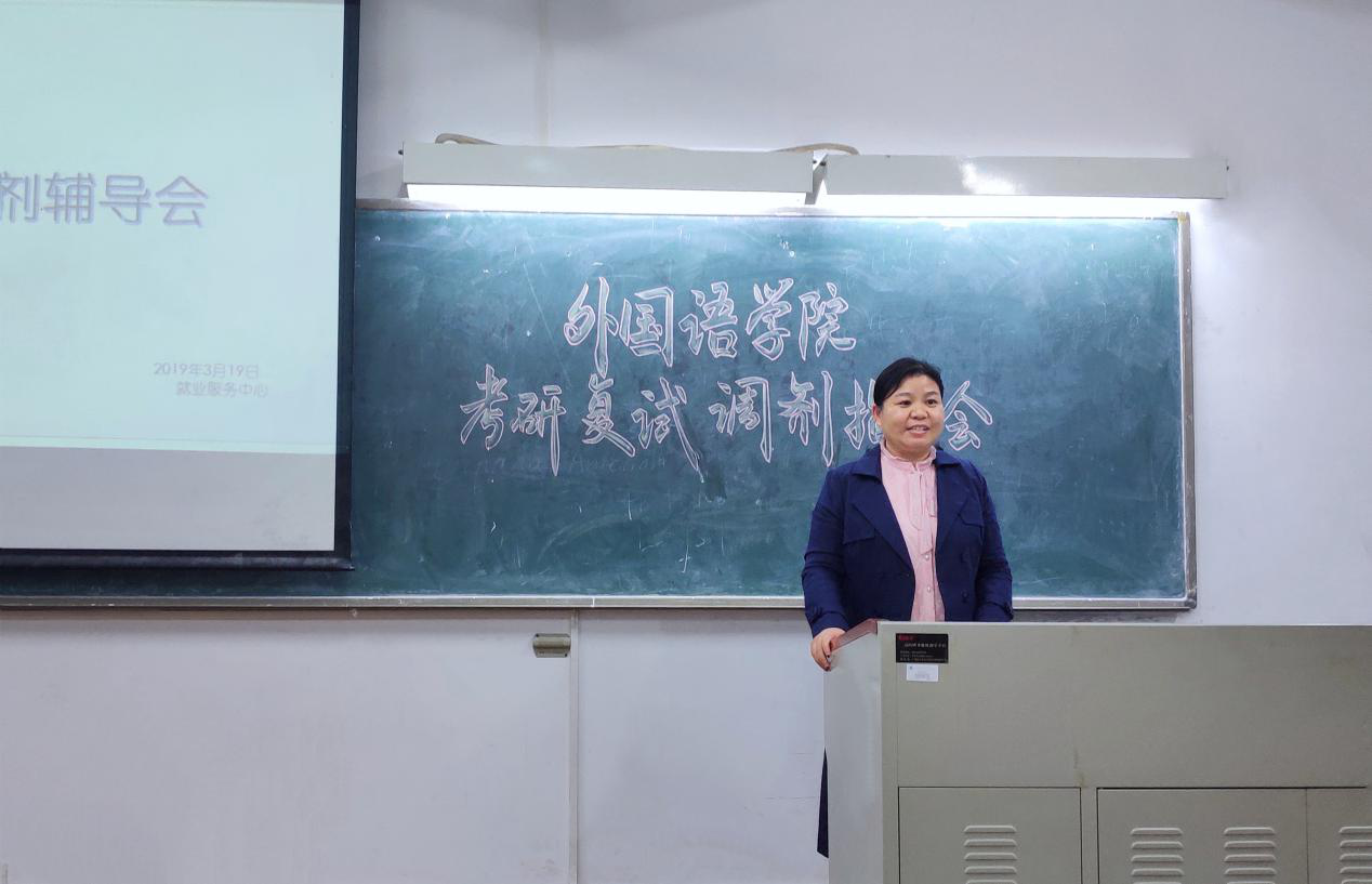 (本站讯 外国语学院杨洁供稿)为鼓励本院学子积极考研,并为准备考研的学生提供经验和指导,2019年3月19日下午6点30分,考研复试调剂指导会在杨钊勋楼503课室举行。本次会议由外国语学院就业服务中心举办,参加本次会议的有外国语学院李磊院长,外国语学院党总支副书记柴明勤,辅导员周静老师,就业服务中心全体成员以及大三大四的部分学生。