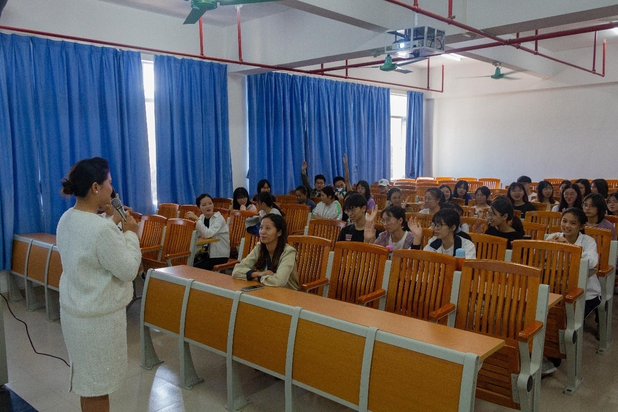 首先,潘婉玲师姐以一个欢乐的抛玩偶活动引入本次活动的主题,紧张刺激的游戏活动使在场的人瞬间沸腾起来,气氛也十分热烈。随后,潘婉玲师姐向在场的学生提出 “什么是礼仪”、“面试需要准备什么”等问题,引起在场同学的思考。紧接着,她以自身工作经历为师弟师妹们指引方向,引导他们思考自己今后的职业方向。她提到人生需要有规划,做事情需要有目标,要有尝试做所有事的勇气。
