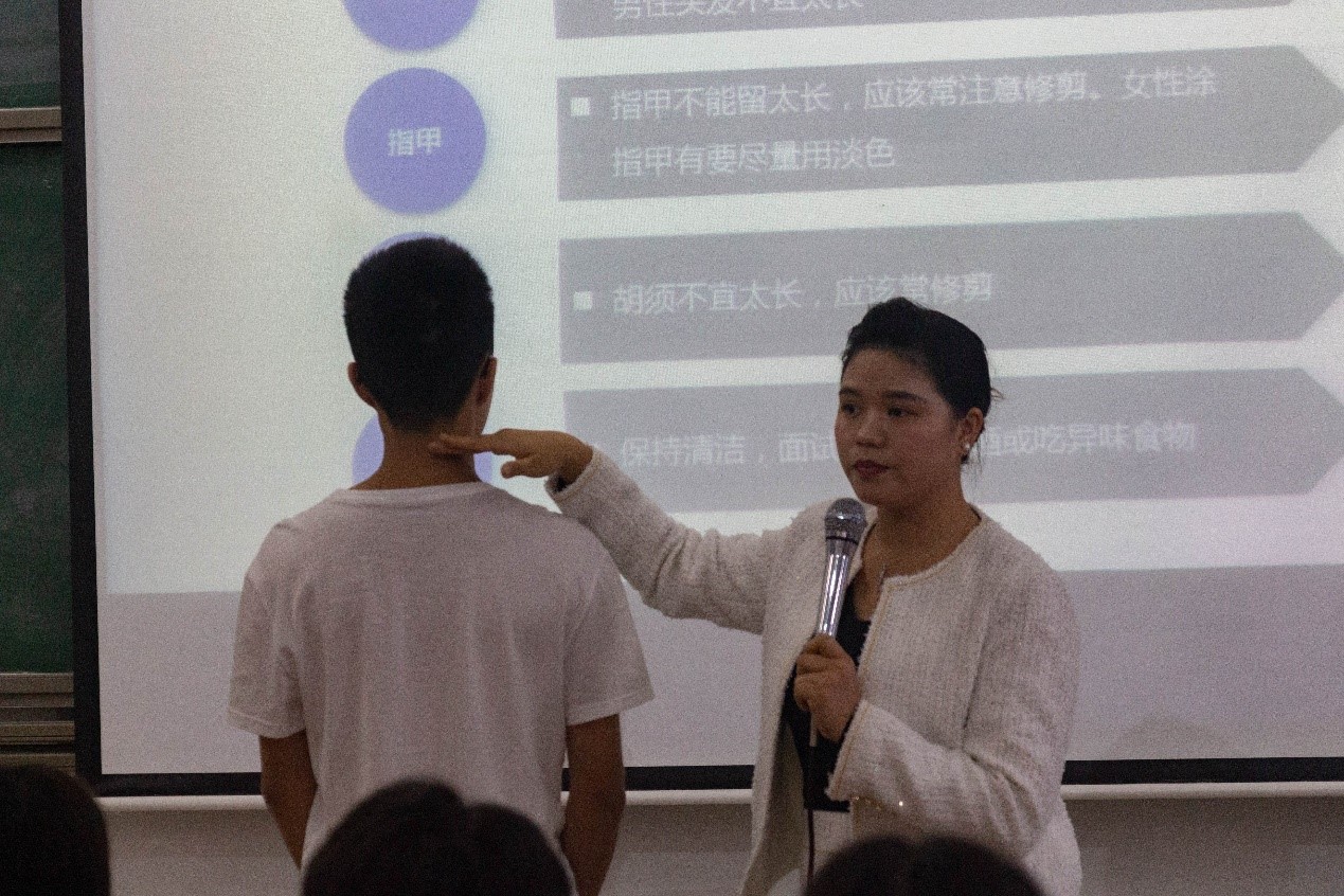 接着,潘婉玲师姐分享了面试时关于仪容仪表方面的注意事项,她提到艾伯特·梅拉比安的“55/38/7”原则,向他们说明第一印象的重要性。而后,她指出一系列在职场中需要注意的小细节,从头饰妆容的整理到打扮穿着的得体,再到动作姿态的端正。一遍遍发型的改变,一次次场合的模拟,一个个动作的纠正都让在场学生更加深刻地学习到面试上的礼仪。最后,便是面试后的告别礼仪。这个时候我们也要继续保持端庄大方的姿态,要有礼貌地与面试官告别。