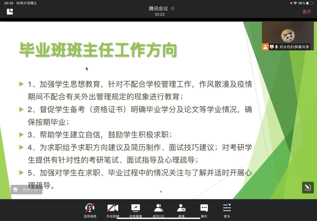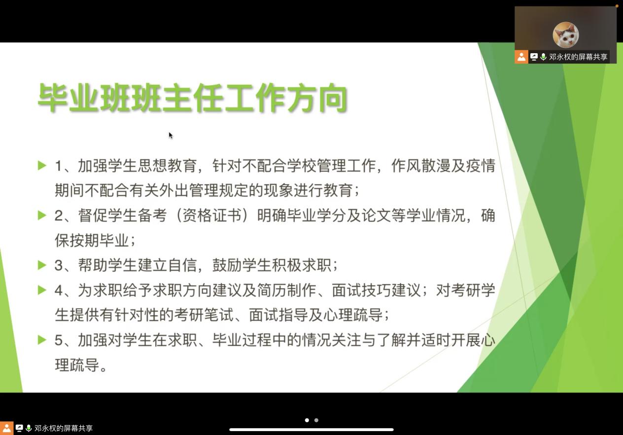 柴明勤也从关心学生学业、促进学生就业、指导学生考研、关注学生心理等几个方面对毕业班班主任们提出几点具体要求。邓永权也就学生在大四阶段需要班主任们配合推进的工作做了详细说明。