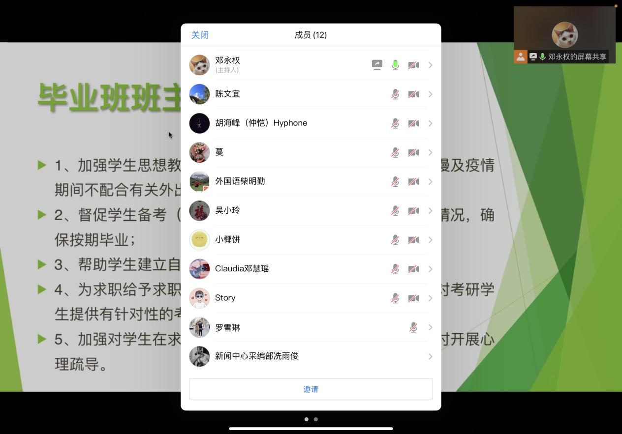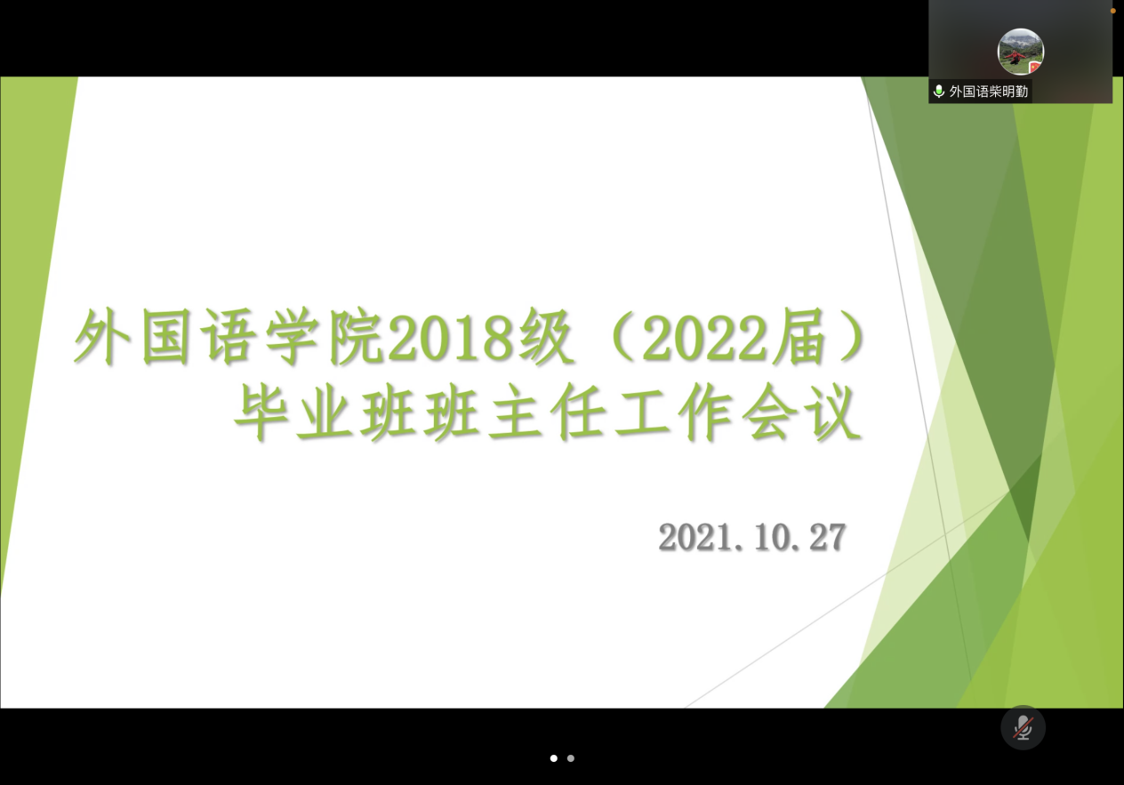10月27日晚,外国语学院召开毕业班班主任工作会议,会议通过腾讯会议平台召开。外国语学院党委书记吴小玲、党委副书记柴明勤、外国语学院辅导员邓永权和各毕业班班主任参加会议,会议由邓永权主持。