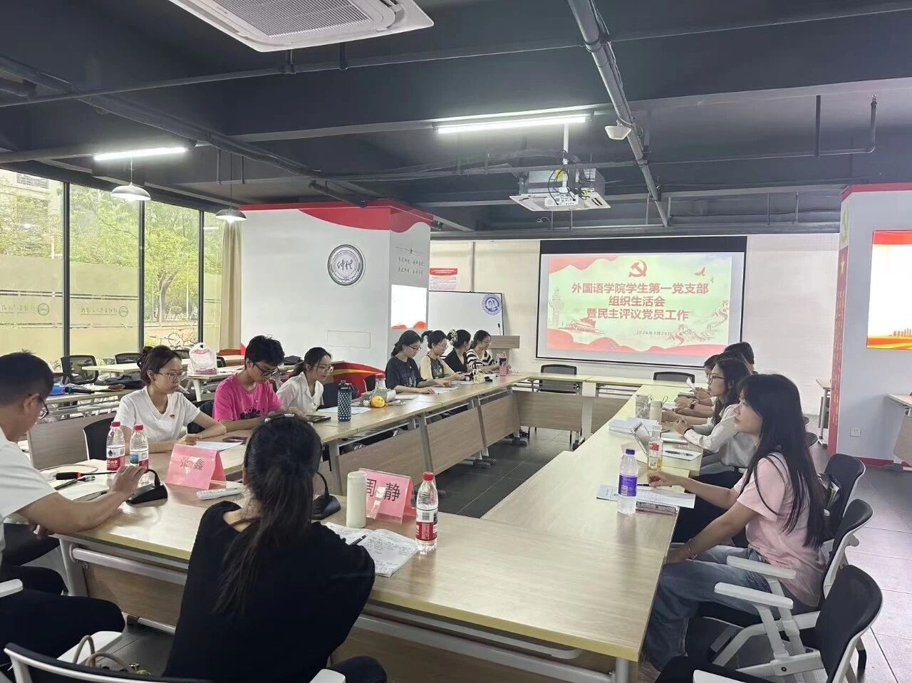 为深入学习党的二十届四中全会精神,规范支部党内生活,提升党员党性修养,发挥党支部凝聚力和党员带头作用,3月26日下午,外国语学院学生第一党支部在23栋党建工作室召开组织生活会暨民主评议党员会议,学院党委副书记周静、支部全体党员、预备党员参会。